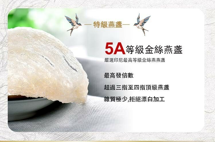 |產品介紹| 嚴選印尼5A+ 超過三指至四指的頂級燕盞,其燉煮後蛋白香氣濃郁。口感潤滑,發倍數極高,雜質極少不漂白,完整保存燕窩營養價值。