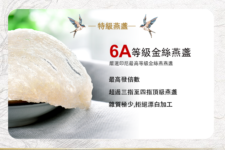 |產品介紹| 嚴選印尼6A+超過三指至四指的頂級燕盞,其燉煮後蛋白香氣濃郁。口感潤滑,發倍數極高,雜質極少不漂白,完整保存燕窩營養價值。