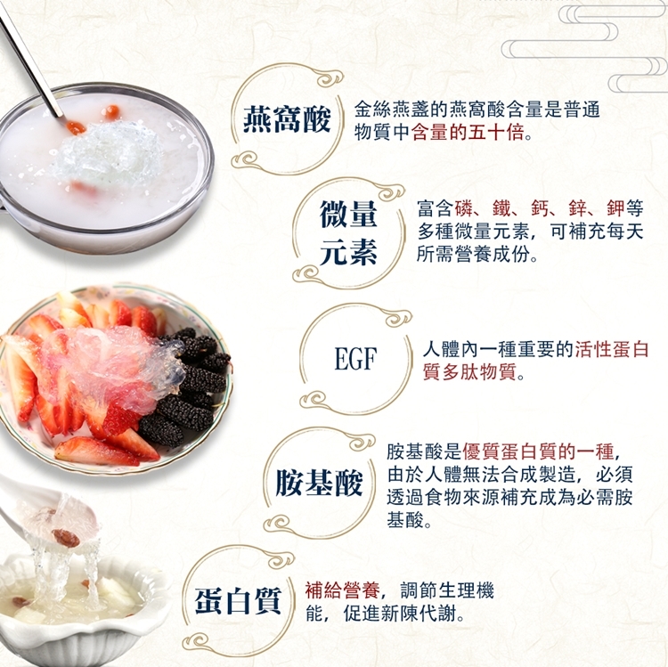 燕窩含有EGF、多種胺基酸、燕窩酸與18種微量元素
