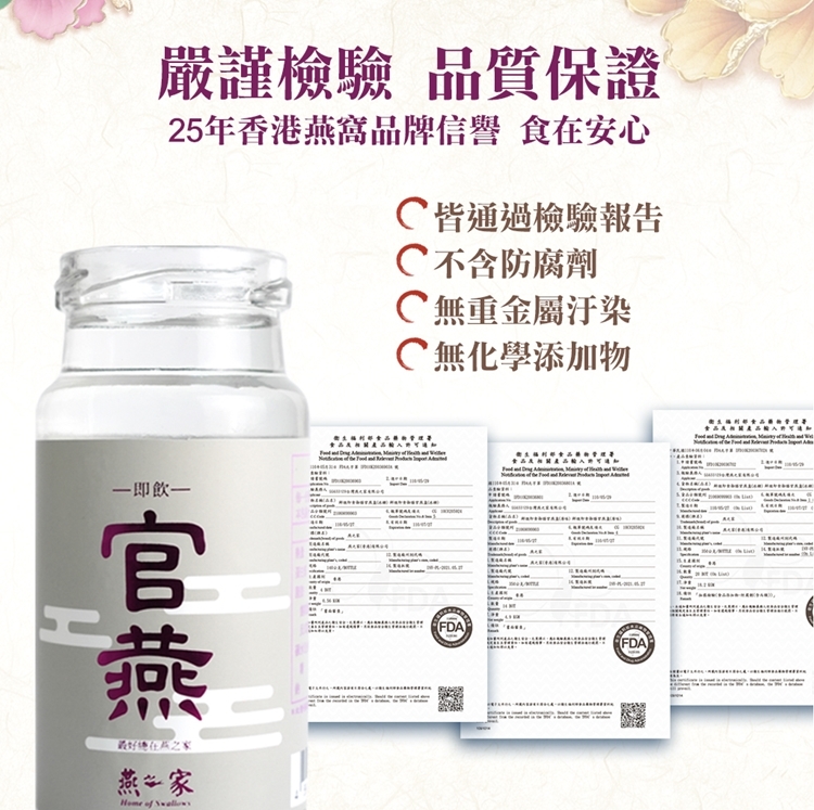 燕之家即飲官燕禮盒138ml,方便即飲,隨時享受燕窩的滋補功效。燕窩中含有豐富的燕窩酸與EGF、氨基酸及礦物質,可幫助補充身體所需營養,保養皮膚彈性及水潤度,增強免疫力,提升健康水平。此禮盒共有六瓶,每瓶138ml,品質保證,是您送禮或自用的最佳選擇。